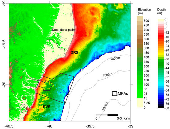Digital Terrain model of the study region. Continental data was obtained from Topodata database (http://www.dsr.inpe.br/topodata/), and bathymetrica data was digitized from sounding sheets provided by the Brazilian Hydrographic Office. The seabed morphology has a spatial resolution of 200m along the continental shelf. PVS: Paleovalley Shelf; DRS: Doce River Shelf. Datum is WGS 84.
