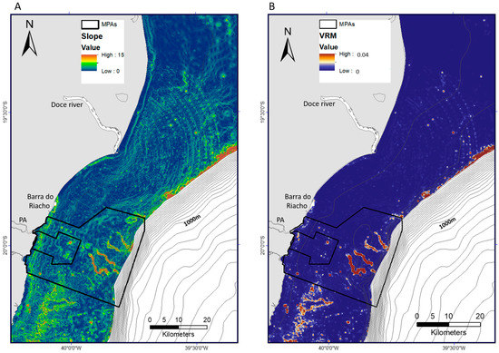 Terrain analysis was carried out using an ArcGIS toolbox, the Benthic Terrain Modeler-BTM [13]. The bathymetric map used for the morphometric calculations has a resolution of 200 m, following the dataset minimum resolution. Slope and Terrain Ruggedness were the input variables used in BTM. Slope represents the inclination of the seabed expressed in degrees and Terrain Ruggedness was calculated using the Vector Ruggedness measure—VRM. This variable represents terrain ruggedness as the variation in three-dimensional orientation of grid cells within a neighborhood, effectively capturing slope and aspect variability into a single measure [14,15]. Slope and VRM calculations is 3 × 3 pixels, following the toolbox default. The morphometric analysis was restricted to seafloor morphology, slope, and terrain ruggedness.