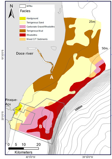 Unlike the Doce River region, the southern section is characterized by a contrasting sedimentary regime (Figure 4). The continental shelf is deficient in sediment supply, with very low or negligible inflow, and is characterized by a sedimentary accommodation-dominated regime. The seabed habitats comprise coarse sediments, predominantly coarse sand, bioclastic gravel fractions, and extensive occurrence of rhodolith beds. These aspects support the transgressive characteristics in the area [10].