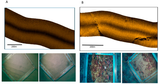 Side scan sonar images and dropcamera seabed frames: (A) Terrigenous fine sediment facies characterized by a homogeneous and low backscatter signal; (B) rhodoliths characterized by a high backscatter signal with acoustic shadows. For images location, see Figure 4.