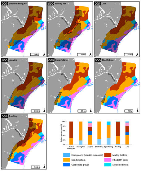 The relationship between fisheries with distinct MSF and the percentage of each fishery activity over each habitat domain is shown in Figure 6. Most trawling (96%) and all bottom-associated gillnet fisheries are carried out in the terrigenous sediment flatbed domains. Over the carbonate domain with higher terrain ruggedness and slope, fisheries activities are related to line and longline fishing, as well as to spearfishing. Across the Doce river inner shelf, for example, the areas identified as muddy bottom habitats are associated with shrimp trawling artisanal fisheries [17], as well as bottom-associated gillnet fisheries targeting carnivorous fishes such as sciaenids, carangids, and elasmobranchs [18]. According to [19], from Barra do Riacho to the mouth of the Doce River, trawling is performed by both artisanal and industrial boats, mostly targeting shrimp. In a more recent survey from workshops with local fishermen, [20] also highlighted that in this southern region adjacent to the mouth of the Doce River, shrimp fishing is widespread due to the concentration of sandy-muddy bottoms, whereas on seafloors with a muddy composition, whiting fishing is more frequent. Along this stretch, the fishing area is continuous and is used from the coastline to the 40 m isobaths.