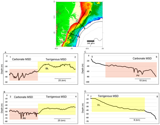 Long-shore and cross-shelf bathymetric profiles and associated MSD. PV—paleovalley; DL—delta front; (A) long-shore, inner shelf bathymetric profile showing the morphological and faciologic transition between MSDs, (B) long-shore, outer shelf bathymetric profile showing the morphological and faciologic transition between MSDs, (C) cross-shelf bathymetric profile along the Carbonate MSD, (D) cross-shelf bathymetric profile along the Terrigenous MSD.