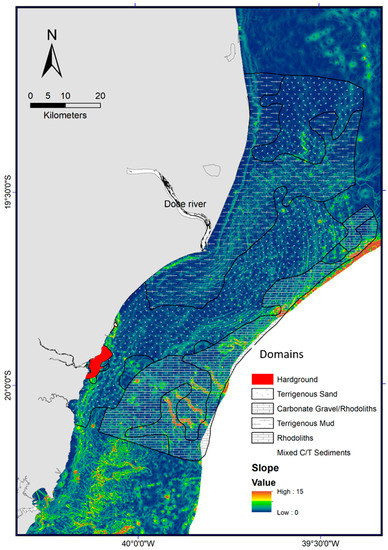 This domain is primarily observed adjacent to the Doce River mouth, extending throughout the inner shelf; it was also observed in a small stretch of the middle and outer shelf (Figure 4). This habitat comprised 29% of the study region. The Terrigenous Mud MSF represents the deltaic lobe morphology, with a gentle slope and extending up to 25–30 m water depth (Figure 3). It is composed basically of terrigenous mud and sandy mud. The lithoclastic composition along the coastal region near the Doce River mouth reflects the continental inflow, representing riverine sediments.