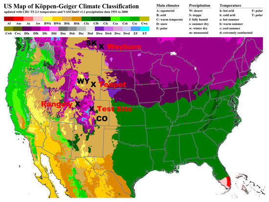 The results of measurements at three different sites in the Rocky Mountains of the western United States will be presented in the results (Figure 1). These sites are at moderate to high altitude (5000–8000 feet; 1500–2400 m), in a semiarid climate with relatively severe winters and a large seasonal contrast. Some discussion will be made of a location within the Weyburn field of Saskatchewan, Canada, at an altitude of 1800 feet (560 m), which is also shown in Figure 1. The soils of the primary measurement sites, i.e., Rangely, Colorado and Teapot Dome, Wyoming, are classed as Bsk in the Köppen climate system (Dry-steppe-kalt (cold); Figure 1). The test site and Weyburn are classed as Dfc in the Köppen system (winter snow cover-fully humid with winter-cool summers; Figure 1).