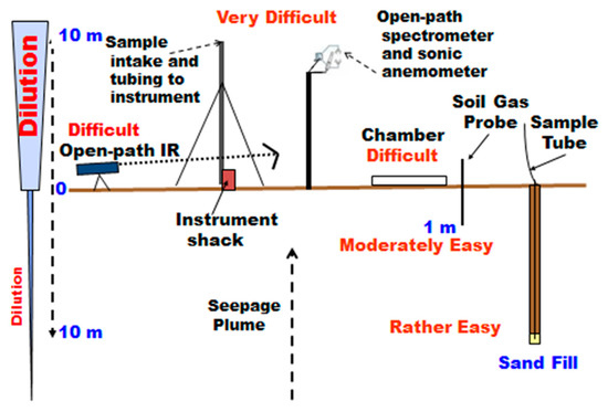Sampling and measurement techniques deserve some discussion. Figure 2 illustrates the effect of elevation above or below the land surface in the effectiveness of the detection of a subtle, deep signal. Tower measurements by eddy covariance (EC) have been promoted by some and there is substantial experience in application to ecosystem and agricultural studies [34]. However, in ecosystem studies, the above-ground and surface biology is the signal that is desired in the measurement. In the MVA application, the ecosystem is noise. The possible, but small deep-sourced signal that is being sought is imbedded in this surface environmental noise. In forested environments, a downward CO2 flux is observed during photosynthesis. There has also been a lack of winter measurements, except for permanent ecosystem programs. It is the opinion of this author that tower measurements in an agricultural or industrial environment will also have difficulties because of seasonal and even diurnal noise.