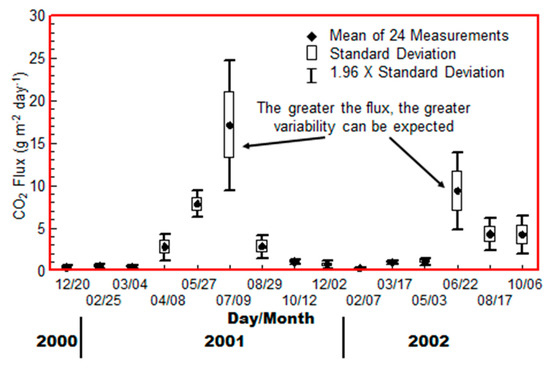 Carbon dioxide flux measurements were made at the background Test Site during a two-year period that corresponded approximately with the Rangely study. The Rangely measurements were made during the peak of the summer and winter seasons. Figure 3 shows the CO2 flux measured in a single day at approximate 6-week intervals [19], which was added to and modified [11]. These consisted of 24-minute and 12-minute integration periods on two adjacent collars set 30 cm apart. The measurements alternated between the two collars with a 30-minute “rest period” between measurements. The rest period is necessary in order to allow the shallow soil gas gradient to recover, as the 12-minute flux measurement distorts the soil gas concentration profile, slowing the apparent flux with time during the integration period.