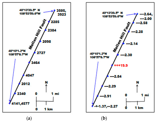 Two trenches were dug into the fault zone to confirm the presence of calcite veins in addition to the float at the surface. Two splays were present, reflecting the CH4 data on the fault x-section of Figure 15a. Samples were taken of calcite and shallow soil materials in the trenches. δ13C and δ18O were determined in these materials. Pedogenic CaCO3 can be recognized by the oxygen isotopic composition. The equilibration of this material with CO2 from the atmosphere is the basis for determination of the temperature of formation using the “meteoric water line” [29]. The pedogenic carbonate formation temperature (8.08 °C) corresponded closely with average recorded temperatures at the Casper, Wyoming airport approximately 30 km to the southwest (7.94 °C) over a 12-year period [19]. It was found that the vein material was formed from oxidation of hydrocarbons (δ13C) at higher temperatures (δ18O).