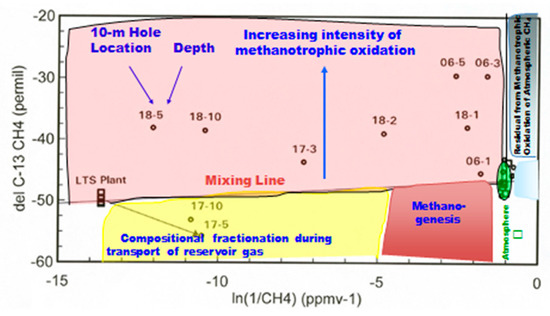 Figure 6 shows the data as location and depth (i.e., 18-5) of a particular measurement. The background locations are close to the right-hand origin represented by the green ellipsoid, having concentrations and δ13 for CH4 close to atmospheric values. Location 18 has high CH4 concentrations and a significant isotopic shift, indicating effective methanotrophy. This contrasts with the 5- and 10-m data for Location 17. The isotopic shift is to more depleted values, which are relatively unusual. This shift can be explained as a slight isotopic fractionation during the migration process from the reservoir. The shift is above the mixing line for shallower depths, indicating that methanotrophy is taking over. LTS is the Low Temperature Separation plant where wet gases are cryogenically separated from the non-condensible gases. The LTS input composition is a composite sample of the reservoir gas. The small green ellipsoid contains the atmospheric composition represented by the □ symbol, samples very near atmospheric composition, and sampling/analytical error.