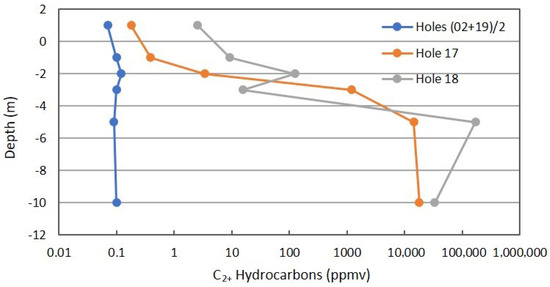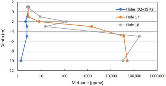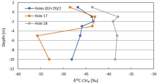 Figure 10 has the profiles for δ13C of CH4, showing a slight shift in the background. The shallow measurements for Location 17 are similar to the background, indicating the sealing at intermediate depths. The profile shifts to more depleted δ13C below the depth of sealing and the isotopic fractionation during migration from depth. The Location 18 profile shifts to more enriched δ13C at 5 m and 10 m, supporting rapid methanotrophy. At shallower depths, no further increase in δ13C occurs, suggesting slowing of methanotrophy at shallow depths during the winter months.