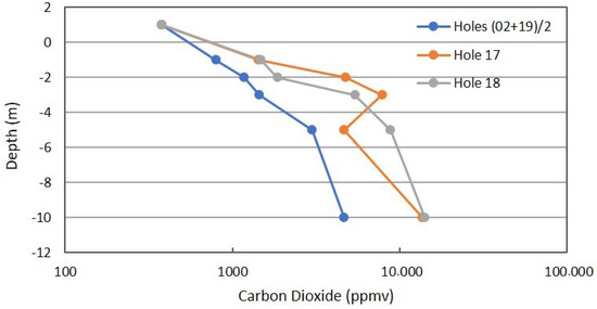Carbon dioxide profile in combined background locations and Locations 17 and 18 in Fault Zone 2. See Figure 5 for the locations.