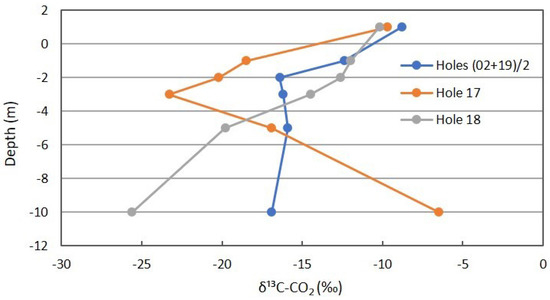 δ13C profile for CO2 in combined background locations and Locations 17 and 18 in Fault Zone 2. See Figure 5 for the locations.