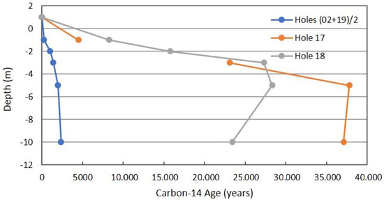 The use of C-14 in areas of continental glaciation presents a potential problem in interpretation and effectiveness in application. At depth intervals below that of modern root respiration, but still in glacial till, may provide Fm values that are intermediate in age. For example, at three half-lives (3 × 5568 years = 16,700 years), decaying organic material in glacial till will have a Fm value of 0.125. Even in the absence of glaciation, shallow samples may exhibit an age of several hundred years, reflecting slow oxidation of humic substances (Figure 13).