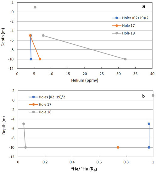 Figure 14a shows the total He for the background and anomalous Locations 17 and 18 [23]. There is a slight shift from the atmospheric concentration in the background location, which may be due to dilution by CO2 (Figure 9). Location 17 deviates only slightly from the atmospheric concentration, which may reflect the low CH4 and CO2 fluxes not carrying reservoir He toward the surface. Also, the seal invoked for Location 17 may be permeable to low atomic weight He gas. Location 18 has a high CO2 flux, invoking continual upward flow of reservoir gases, carrying reservoir He with the dominant components.