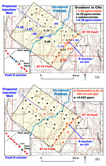 Figure 15 shows the CH4 concentration gradient (Figure 15a) and the presence of detectable C2H6 (Figure 15b) in the 100-cm soil gas sample. Only a few of the 40 locations in the survey had soil gas CH4 gradients >1.00 ppmv/meter. Substantial numbers had an indeterminate gradient or a negative gradient indicative of methanotrophy. The short profile over the fault had 6/10 samples with a gradient >1.00 ppmv/m. The results were similar for detectable ethane in the 100-cm soil gas sample (Figure 15b). The short profile had 9/10 samples with detectable ethane. Two of the short profile samples had detectable propane. The three detectable ethane samples surrounding the proposed injection well are unexplained, as no injection had yet occurred.