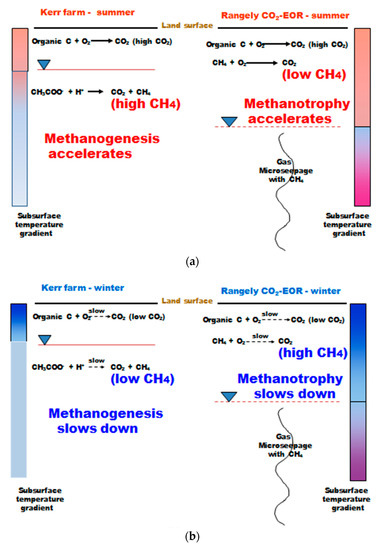 Figure 16 shows this author’s interpretation of the seasonal variation in biogeochemical processes operational at Weyburn and Rangely. Figure 16a shows a simplified chemical reaction of summer methanogenesis by acetate reduction producing CH4 for the Weyburn site. The dry climate of Rangely does not have methanogenesis operational, but has methanotrophy from deep-sourced CH4. During the winter, methanogenesis slows at Weyburn and methanotropy slows at Rangely (Figure 16b). The net effect is that the magnitude of the seasonal soil gas CH4 signal reverses when making the Weyburn-Rangely comparison.