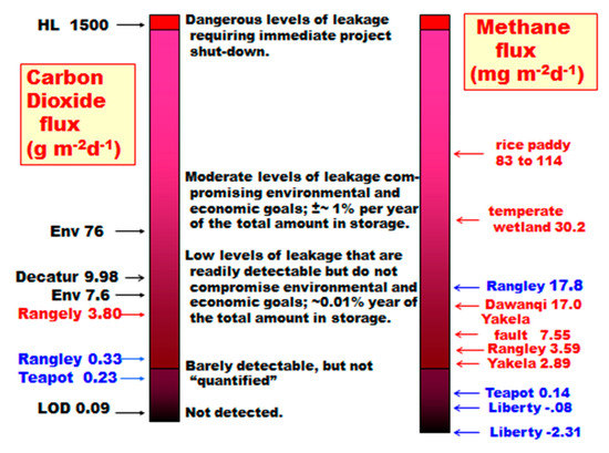 A selection of gas seepage levels for CO2 and CH4 is illustrated in Figure 17 to place measurements in perspective. The range for common environmental levels was provided by Benson and Hepple [40]. The Decatur measurement is for several years of averaging in three seasons, excluding the winter season [41]. Horsehoe Lake (HL), California, originated from a passive volcanic gas venting event [42,43]. The red and blue lettering for Rangely, Teapot Dome, and other measurements are for winter and summer measurements, respectively. The limit of detection (LOD) shown for CO2 is for the Licor 7000 used by the author at Rangely and Teapot Dome. The LOD for CH4 is more complex, and the absolute value is |0.45| mg·m−2·day−1. The value represents one determination in the 1.00 m2 flux chamber. Methane frequently has negative fluxes as well as positive fluxes. The LOD of 0.45 for CH4 is the absolute value for a single small positive or negative flux measurement. In the case of the Frio experiment in a warm, wet southeast Texas environment, the negative flux observed in 2004 was greater in magnitude than that measured in 2005 [44]. This result was attributed to much wetter conditions in 2005, giving methanotrophs less vertical space to operate in the unsaturated zone.