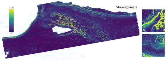 The surface gradient provides valuable information for environmental applications of DTMs. Slope and aspect form a gradient representing the first order derivative of the surface, and are implemented in ArcGIS and BTM using the method of Horn [], which uses a  neighborhood (also known as the Moore neighborhood []) for its analysis, operating on a planar surface. Instead of using the Moore neighborhood, a quadratic can also be fitted to the surface at the point of interest. The Wood-Evans method [,] implements this approach to slope, and can be computed at arbitrary window sizes. The algorithm is implemented in Jo Wood’s Landserf [], and is also available in ArcGIS with the ArcGeomorphometry extension []. Dolan et al. [] compare slope algorithms for benthic geomorphometry and the effects of scale on the results, and recommend both the Horn and Wood-Evans methods for capturing slope in planar bathymetric data over other available methods.