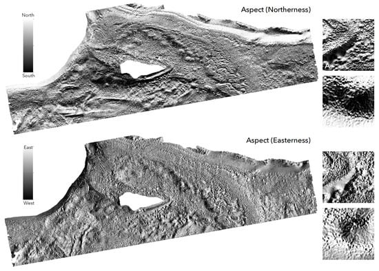 Aspect: Aspect measures surface direction. In ArcGIS, it ranges from 0 to 359.9 degrees, measured clockwise from north, and −1 for locations of no slope, based on the same Horn [] method. BTM augments this with an additional aspect calculation, which converts aspect into two variables: Northerness , due south to due north, and easterness , due west to due east [,].