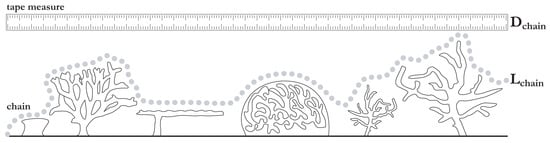 The tape-chain rugosity measurement is an in-situ method of evaluating terrain heterogeneity. The ratio of the chain length () to profile length () describes the rugosity of the two dimensional profile. Used under Creative Commons Attribution license (CC BY) from Friedman et al. [].