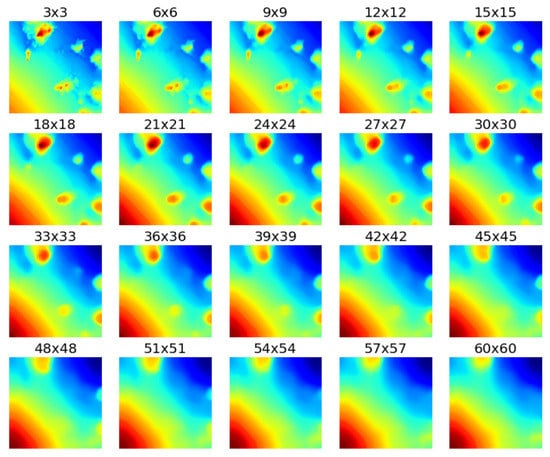 Output from Compare Scales of Analysis tool, with Median calculated for focal neighborhoods ranging from  to . Fine scale detail is lost by the  neighborhood, and only broad trends remain at the  scale.