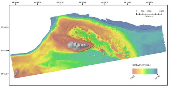 Buck Island Reef National Monument (BIRNM) is a protected area northeast of Saint Croix, U.S. Virgin Islands. Established as a protected area in 1961, both it and its surrounding seascape are well documented; the site has had extensive study of its ecology by NOAA scientists [,,]. Here, our focus is not on producing a specific new map for a location, but to highlight the analytical workflows possible using BTM and its allied tools, and Buck Island provides an excellent testing ground. The reef area has extensive coverage of both MBES and LiDAR (including reflectance values), which we use for our analysis. We restricted our efforts to the LiDAR covered shallow depth locations (depth ), which include an additional LiDAR reflectance product that can be used in other packages to derive additional terrain attributes [], here used in our covariate comparison.