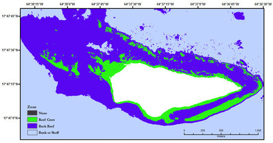 A habitat classification map created for a subregion of Buck Island National Marine Reserve using the Run All Model Steps tool. The white zone represents terrain above sea level.
