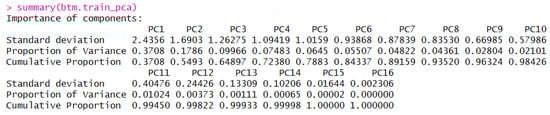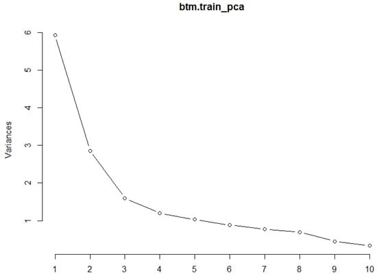 Results of the PCA analysis can be explored using functions like summary() (Figure 9) and plot() (Figure 10) to determine the proportion of variance explained by each component and which components together are able to explain up to 95 percent of the variance. From this point, results could be used to determine the most influential covariates which could then be used to construct a predictive model and assess model fit.