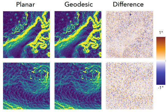 We compared Slope differences between the traditional planar form and its new geodesic variant for our example site. In most locations, little variation is seen. High rugosity areas show more marked variation, with valleys between peaks showing the biggest declines, and the edges of steep peaks showing the greatest increases (see Figure 11, Difference pane). Over the full raster, the two layers are highly correlated (Pearson correlation ). Because of this high correlation, we only relied on planar slope in our broader comparison between covariates.