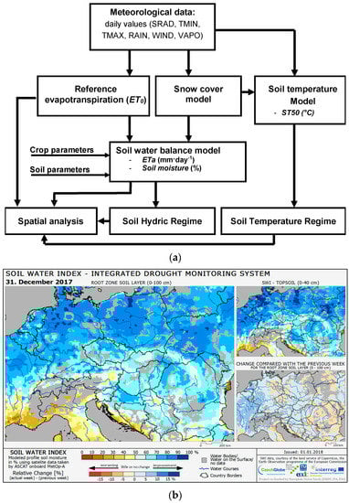(a) Diagram of data processing in the soil moisture and drought intensity model SoilClim; (b) current area of interest covered by the weekly drought monitoring efforts.