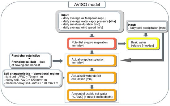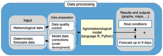 The AVISO agrometeorological model is based on the English model MORECS (“The Meteorological Office Rainfall and Evaporation Calculation System“), version I. and II. [,,,,]. Currently, the core of the model, with computational algorithms, was reprogrammed into the R language environment. The additional modules for the preparation of various data inputs, spatial calculation, creation of maps, and also input forecast data processing are made in Python.
