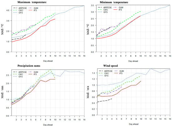 MAE (mean absolute error) as difference between forecast and measured meteorological element for maximum air temperature (upper left), minimum air temperature (upper right), precipitation sums (bottom left), and wind speed (bottom right) for the given number of days ahead (horizontal axis).