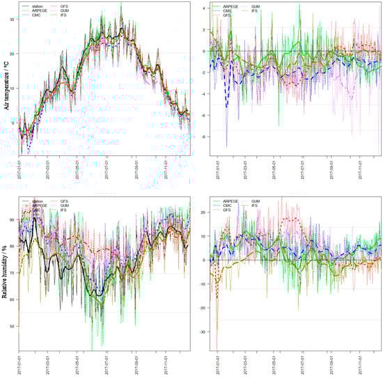 (Top left): maximum temperature (in °C) predicted by five meteorological models for 3 days ahead and reality (black) in the Czech Republic in the year 2017. (Top right): maximum temperature differences of the NPW outputs with regard to reference series (reality based on station data interpolated into maps). Thick lines: values smoothed with 30-day low-pass Gaussian filter. (Bottom): the same as above but for relative humidity (in %).