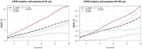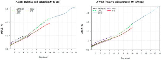 Relative MAE (mean absolute error), as difference of forecast and AWR (relative soil saturation) in two depths: (left) upper (0–40 cm) soil profile, and (right) deeper (40–100 cm) soil profile.
