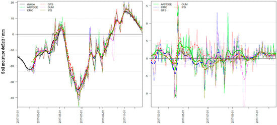 (Left) Comparison of the meteorological forecast of the soil moisture deficit in the whole profile (0–100 cm) provided by 5 NWP models for 3 days ahead and reality (black) in the Czech Republic in the year 2017. (Right) Differences of the NPW outputs with regard to reference series (reality based on station data interpolated into maps). Thick lines: values smoothed with 30-day low-pass Guassian filter.
