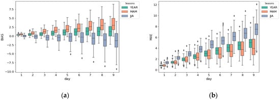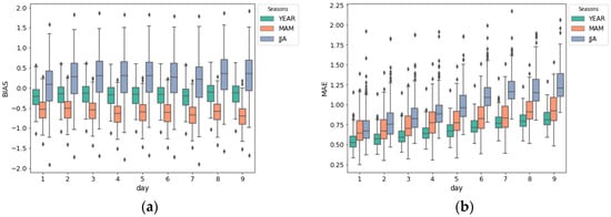 BIAS (a) and MAE (mean absolute error) (b) evaluated from daily differences of values of potential evapotranspiration calculated from forecast data and real measured data for year (YEAR), spring (MAM—March, April, May) and summer season (JJA—June, July, August) from the 1st to 9th day of the forecast in the year 2017.