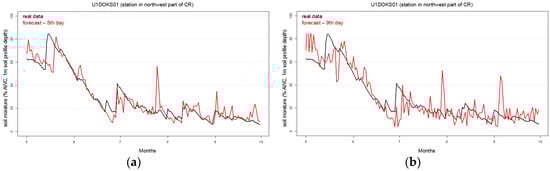 The drought episode was most intensive from half way through June to the middle of July. In this period, most of the prediction models forecast (1–9 days ahead) more intensive drought than in reality (see Figure 7 for an example of the IFS model). The exception was the GFS model, which overestimated convective precipitation and therefore predicted quicker soil moisture replenishment. On the contrary, at the beginning of the dry period from May to June 2017, models tended to predict more soil moisture than there actually was in the upper soil profile. In the deeper profile, the model forecast for 1–8 days ahead was drier than in reality from the beginning of May 2017. The situation at the beginning of November 2017 was interesting, when the models anticipated a quicker replenishment of soil moisture in the profile of 40–100 cm than actually happened in reality.
