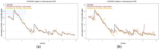 The course of soil moisture content (in % AWC) calculated from measured meteorological station data and forecast data for the 5th (a) and 9th (b) day of the forecast in the evaluated part of the year 2017 at Doksany station.