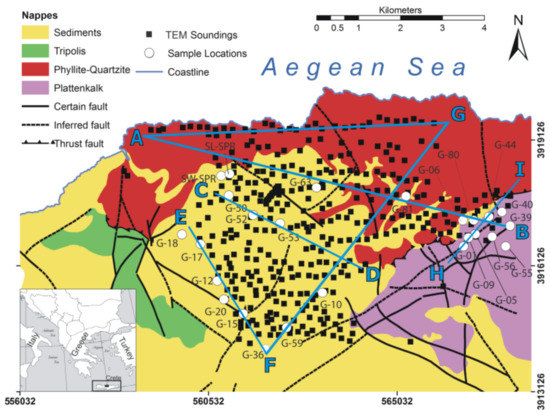 Geophysical method, especially Transient ElectroMagnetic (TEM) technique, as non-invasive and cost-effective, remains the first choice for aquifer imaging. During the last few years TEM technique has become increasingly popular for hydrogeological purposes with very good results, especially for the investigation of seawater intrusion problems because it is very sensitive to conductive anomalies. Much has been published on the TEM geophysical technique, including applications in hydrogeological research [1,2,3,4,5] and for studying the specific problem of salt water intrusion [6,7,8,9,10,11,12,13,14]. Concerning hyrdo-geochemical analysis, extensive research has taken place in coastal regions in order to identify the source of contamination (among others [15,16]).