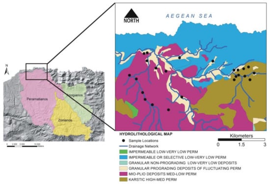 - Sdao, F.; Parisi, P.; Kalisperi, D.; Pascale, S.; Soupios, P.; Lydakis-Simantiris, N.; Kouli, M. Geochemistry and quality of the groundwater from the karstic and coastal aquifer of Geropotamos River Basin at north-central Crete, Greece. Environ. Earth Sci. 2012, 67, 1145–1153. [Google Scholar] [CrossRef]