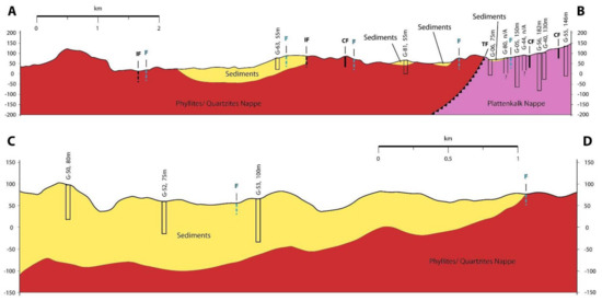 The CD, EF and FG geological cross-sections (Figure 2) cross mainly above sediments, superimposed to Phyllite/Quartzite nappe, for which their thickness was approximately estimated by the available data (geological map and borehole logs). CD and EF are 4 km long, while FG cross-section is 7 km long having NW-SE, NNW-SSE and SSW-NNE directions respectively. Their 2D geoelectrical models (juxtaposed 1D inversion models) (Figure 4) demonstrate that the resistivity values of these sediments vary depending on the rock types from 100 to 500 Ω·m (Neogene limestone, clays, gravels, etc.); however when Neogene limestones are more cohesive and stiff, the resistivity values are even more increased up to 1000 Ω·m. Generally, due to resistivity values overlapping between Phyllite/Quartzite nappe and sediments, it is hard to distinguish them. Boreholes confirm that there is groundwater in sediments, which is confirmed by TEM data, where the recharge zone is defined with resistivity values 20–40 Ω·m. Low resistivity areas at deeper layers are evidence for fracture zones in the Phyllite/Quartzite nappe. These zones are conduits for seawater intrusion, and consequently contamination of the groundwater (low resistivity areas shown with blue colour).