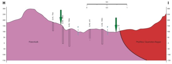 Finally, the HI geoelectrical model is a small part (2 km long) of HI geological cross-section and crosses only the plattenkalk nappe. The high resistivity values indicate the dolomites and dolomitic limestones on the top (up to 100 m depth). Then the aquifer system is clearly identified and it is confirmed once more that TEM technique is very good for identifying conductive zones underneath resistive layers. The water table (80 m–100 m from the surface) and the interface between fresh and brackish waters (beginning from 110 m from surface) are depicted in section HI of Figure 5.