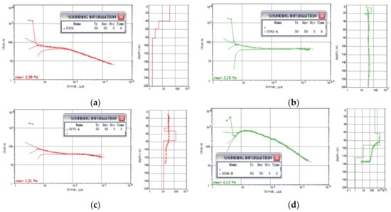 Once the resistivity data were derived, the next stage was modelling of the data, as the ultimate goal was to deduce the subsurface resistivity distribution (resistivity-depth information) from these sounding curves. TEM soundings are commonly used to define aquifer properties and other subsurface characteristics. Although those kinds of structures are multi-dimensional, 1D inversions are used to determine geological structure for groundwater flow models. TEM-RES software was applied for the inversion procedure. The formulae that TEM-RES software uses for this procedure are not described in this paper and can be found in [29]. The number of layers was up to 5 and the thickness was not fixed. For better interpretation, after manufacturer’s recommendation, an upper threshold 1000 Ω∙m was set (resistivity limit). The expected depth of investigation of the soundings is about 150–200 m [29]. As already mentioned, the raw data quality was very good and the RMS errors after inversion was 0.5%–5%.