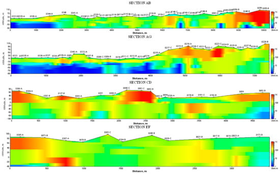 The 2D visualization is presented in Figure 5 (sections AB, AG, CD, EF, FG, and HI). The sections that were chosen for 2D visualization lie along the geological cross-sections (Figure 3) for direct comparison between the geology and resistivity results except for geoelectrical section AG (7 km long, parallel to the coastline) where no geological cross-section was constructed since this section is exclusively on the Phyllite/Quartzite nappe. Note that HI geoelectical section is part of the HI cross section as marked in Figure 3 with green arrows. Hot colours (red) represent high resistivity formations, while the cold colours (blue) depict the low resistivity units. The 3× exaggeration of all the sections is the same as that used for the construction of the geological cross-sections (except for the HI and AG where the exaggeration is ×1 and ×4 respectively). For all the profiles the resistivity scale ranges between 1 Ω·m and 1000 Ω·m (resistivity limit set by the analyst).