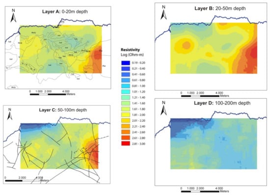 The final 1D inverted models from all the available TEM data were finally merged to form slices differentiated with depth (Layers A, B, C and D). The roof and the bottom of each layer [for example: for layer A, roof = 0.0 m (surface) and bottom = 20.0 m (20 m deep from the ground surface)] are defined using the TEM-RES software. Thus, the selected layers are extracted, where each layer includes the information of the average resistivity (in Log Ω·m) of each point. For example, for layer A (0.0–20.0 m depth from the ground surface) for each of the 350 points an average resistivity value was extracted (for these 20 m only). Then, all this information was inserted in a GIS environment for spatial distribution map construction (one map for each layer) using ordinary kriging interpolator.
