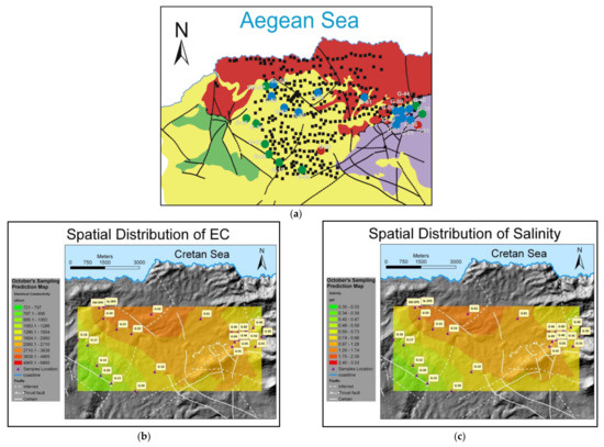 Hydrolithological classification of the geological units based on permeability was based on previous study by [26]. According to that classification, the northern part of Geropotamos basin (where the Phyllite/Quartzite nappe lies) is characterized as almost impermeable rock (Figure 2), whereas the eastern and southern part (dolomitic limestones) is shown to consist of permeable formations. Previous ideas of an impermeable formation along the coastline (Phyllite/Quartzite nappe) forming a barrier to seawater intrusion, is contrary to the results of this study. Thus the tectonic setting is a very important factor that probably supports the scenario of seawater intrusion, where the faults network acts as the major pathway of groundwater salinity into the aquifer. The sweet-salty spring phenomenon that takes place at the north-western part of the study area demonstrates the complexity of underground water pathways. The situation is not investigated explicitly and it is not part of this research, but it is in the future plans of the authors.
