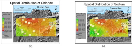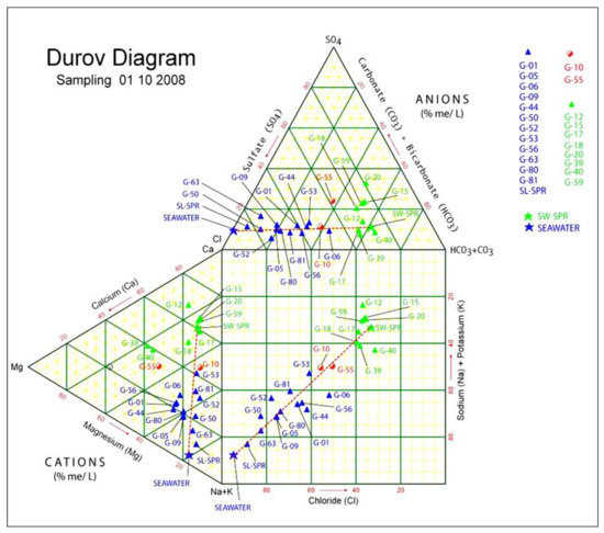 As presented in previous work [19] groundwater chemistry data were obtained in order to check the quality of the waters and to test the hypotheses of evaporite domes or seawater intrusion in the study area. Spatial distribution maps were constructed using the results of the determination of the chemical parameters in the samples of the October 2008 sampling period (ordinary kriging method). Representative maps of four parameters (EC, TDS, Na, Cl) are shown in Figure 7. Figure 8 shows maps of water quality distribution and the type of water of each sample location was characterized (based on the dominant ion), as well as Durov diagram (Figure 9) was constructed in order to identify the source of salinization (seawater or halite). The red dotted line represents the marine composition line (mixing line), joining the end-members—fresh water (SW-SP) and Aegean seawater (green and blue star respectively). It is noted that the ion concentrations of the Aegean seawater were taken from [30].