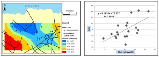 Figure 8 comprises the GQI map of the study area. Hot colours indicate the good water quality, while the cold colours indicate the bad (maximum groundwater quality = 100). A scatter plot of the GQI with the resistivity data of Layer D (Figure 6) is presented in Figure 8 as well. The correlation coefficient R that occurs is 0.3848.