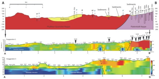 As already mentioned, Phyllite/Quartzite nappe is considered almost impermeable, except for faults that could be major potential conduits of water flow inland. The north-western part of AB 2D geoelectrical model (Figure 10) shows the seawater encroachment and complements the seawater intrusion scenario. It illustrates the low resistivity values (blue colour) situated into the Phyllite/Quartzite nappes 25 m under the surface extending up to 1.5 km inland and it is considered as the strongest evidence for this scenario. Based on rock types, two different types of aquifer are expected. Sediments are expected to host a shallow aquifer (G-63 and G-81 are evidence—Figure 10) which lie above Phyllite/Quartzite unit. The problem is that resistivity values overlap (Table 2) and it is hard to separate them, which is part of the limitation of geophysics [34]. The deeper aquifer is expected to be found in discontinuities (fracture zone in Phyllite/Quartzite nappe or karst in Plattenkalk unit).