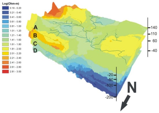 The data presentation is completed by Figure 10, showing correlation between the geological cross sections and geoelectric profiles. Finally Figure 11 illustrates a three-dimensional view of the distribution of resistivity of the rock mass in the study area, highlighting the low resistivity in association with the location of the coastal area. The four resistivity layers (Layer A: 0–20 m, Layer B: 20–50 m, Layer C: 50–100 m, Layer D: 100–200 m) (interpolated maps of TEM resistivity values in different depths) are represented with heights obtained by DEM (Digital Elevation Model) showing the relief of the study area. All the layers together are shown in Figure 11. This image mainly was constructed in order to make clear the physical mechanism of the seawater intrusion. From the physical point of view, seawater intrusion cannot occur above the sea-level, so the NW part of the study area was contaminated firstly through fracture zones (low elevation), while the salinization of the SE part of the study area is shown only in Layer D.