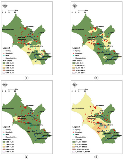 Distribution maps (a) NO2−; (b) NO3−; (c) NH4+; and (d) Electrical Conductivity (E.C.).